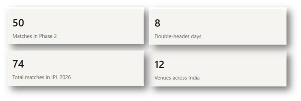 The main reason is elections in Tamil Nadu, West Bengal, Assam, and Kerala. During elections, police and security forces are tied up with election duty — which means they can’t be deployed at IPL matches. So the BCCI had no choice but to pause the tournament and release the schedule in two parts. This is also why the Phase 2 schedule was announced later than usual.