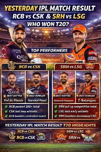 Overall, the yesterday IPL match result T20 showed that RCB and SRH are in strong form in IPL 2026. If you missed the matches, the clear answer to yesterday match who won T20 is RCB and SRH. Both teams dominated their games and look confident going forward in the tournament.